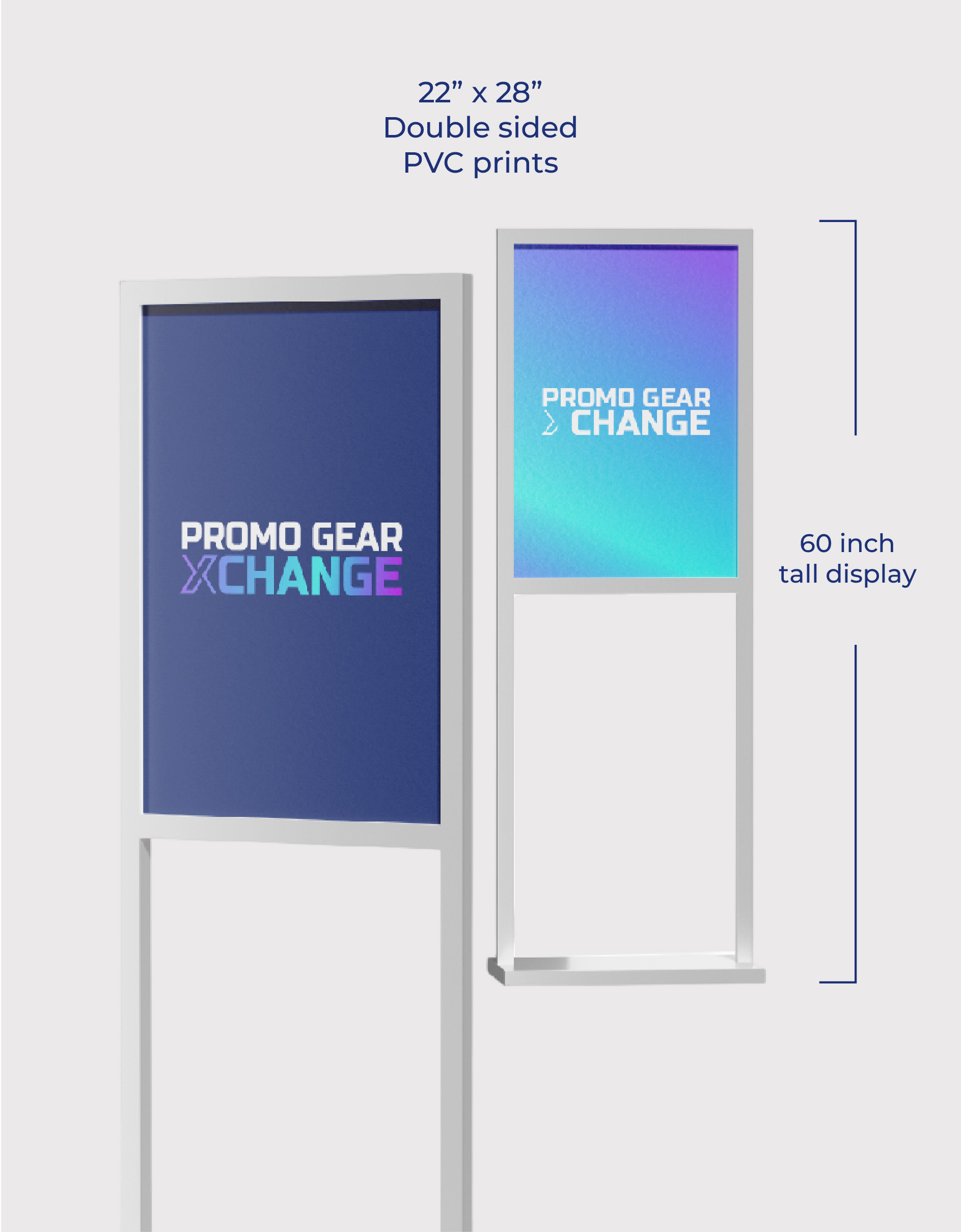 Our floorstanding Poster Stand accommodates a 22″ x 28″ drop in rigid graphic and stands 60″ tall. This sign holder is perfect for retail advertising, commonly seen in front or mid-store. Our direct print double-sided PVC graphics easily drop in the frame for quick display.