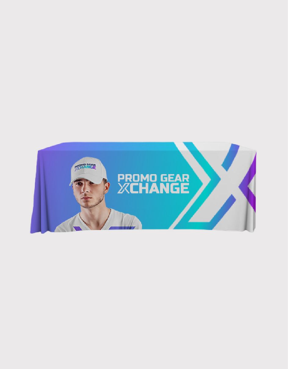 Our standard table cover is a great table topper for trade shows, exhibitions, and any presentations. Our table covers are dye sublimated and are 100% washable if it ever gets dirty. This table cover is made from our 8.8 oz. polyester table fabric that drapes over 3 sides of a 72″ x 30″ x 30″ display table. The table cover is sewn with rounded corners and hang approximately 2″ above the floor. Complete your presentation with our simple and cost-effective table cover.